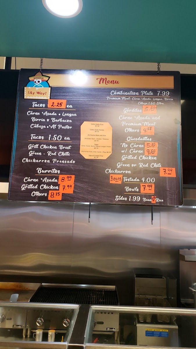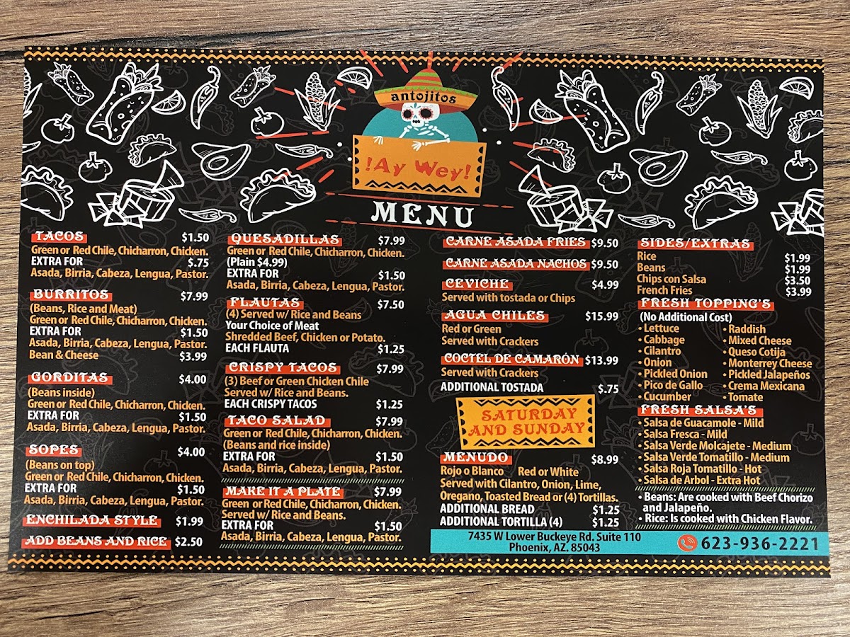 Antojitos Ay Wey! offers an exceptional and vibrant menu, catering to those craving a true taste of Mexican comfort food. Located at 7435 W Lower Buckeye Rd, Phoenix, AZ, the restaurant presents a delightful variety of dishes that blend traditional flavors with a modern twist. Their Antojitos Menu features a range of mouth-watering options perfect for sharing or indulging on your own. Start off with their delicious Tacos ($2.50 each), which come in a variety of fillings, from flavorful carne asada to tender al pastor. The Quesadillas ($6.00) are another must-try, with gooey cheese and your choice of filling like grilled chicken or beef. If you're looking for something a bit heartier, the Tostadas ($5.50) will not disappoint, topped with fresh ingredients and savory meat choices.